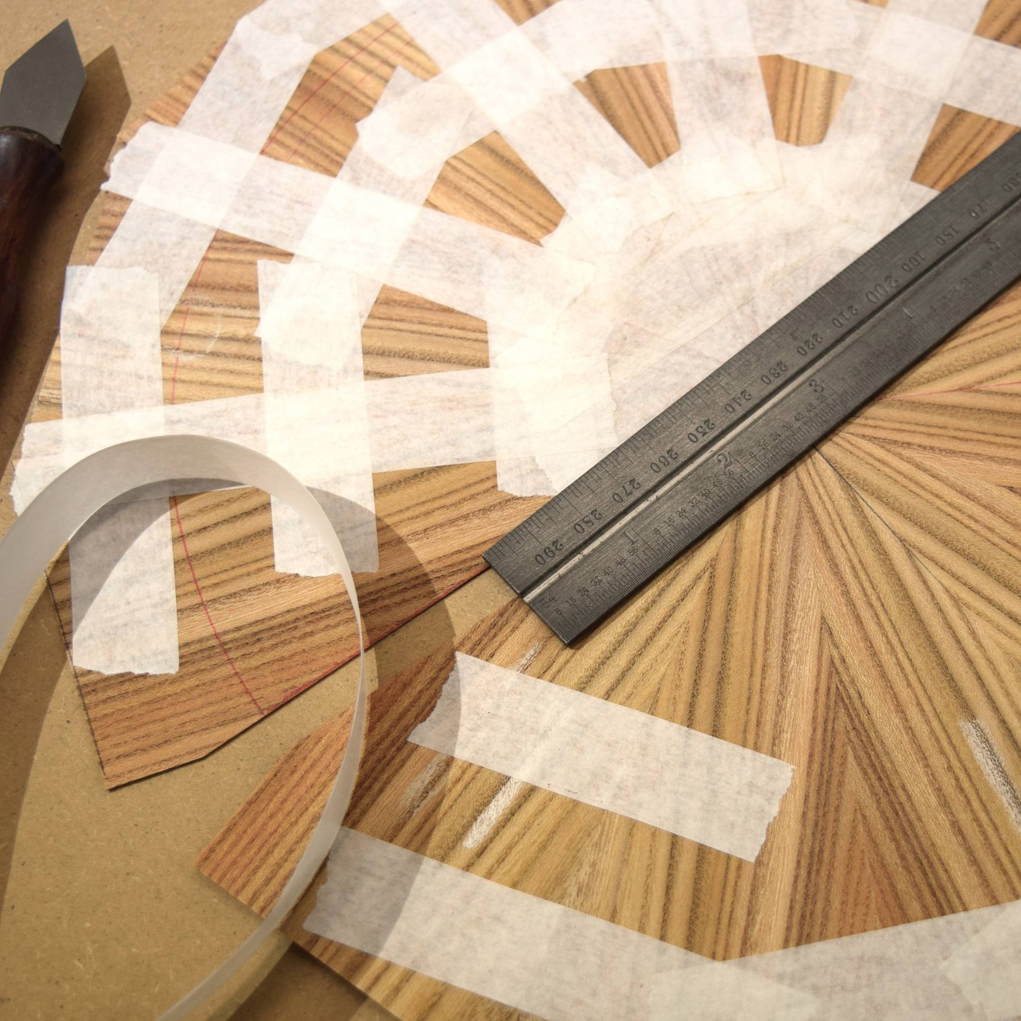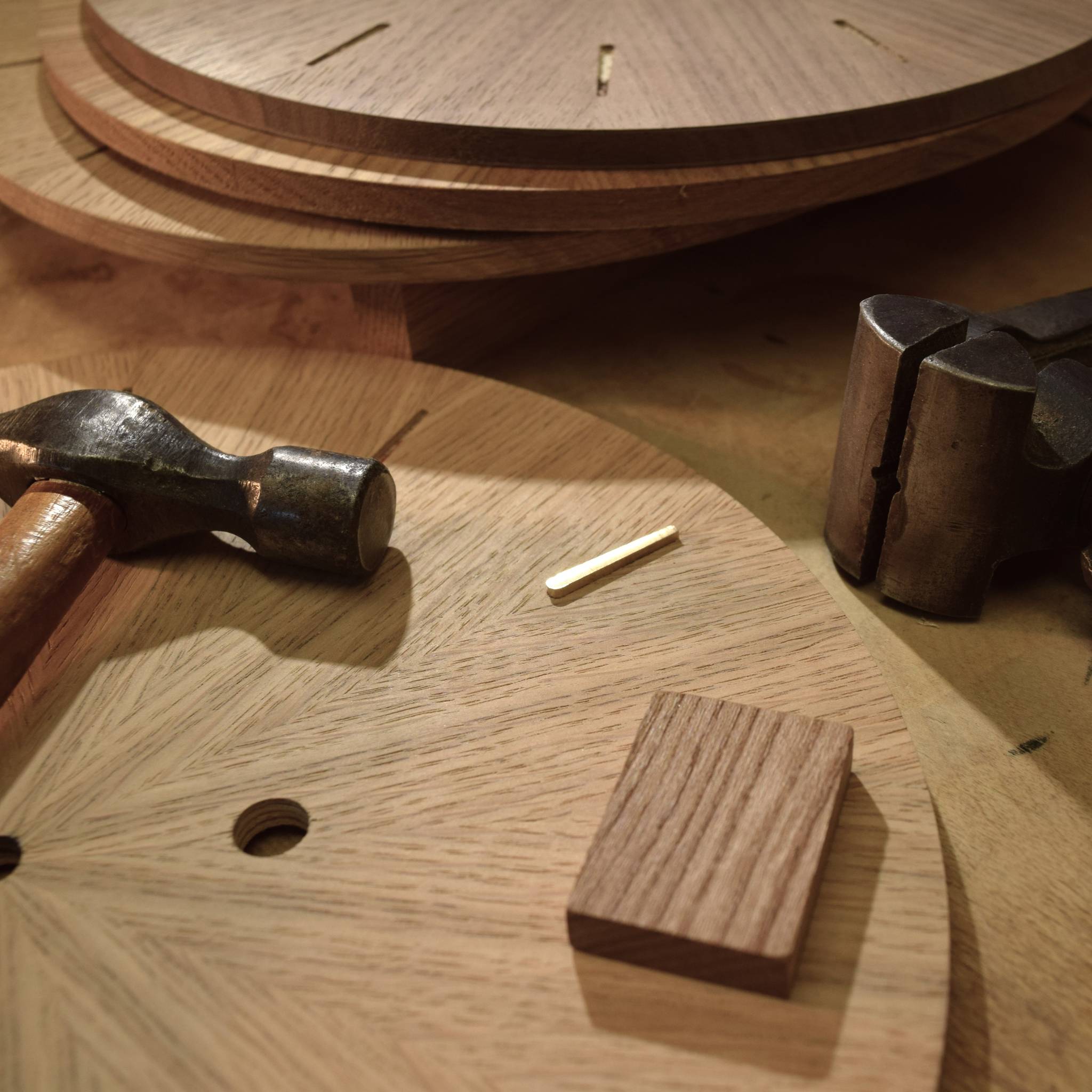 The start of any piece always begins with considered material selection. We carefully select the best veneer to create a sunburst pattern which defines the dials twelve chapters.