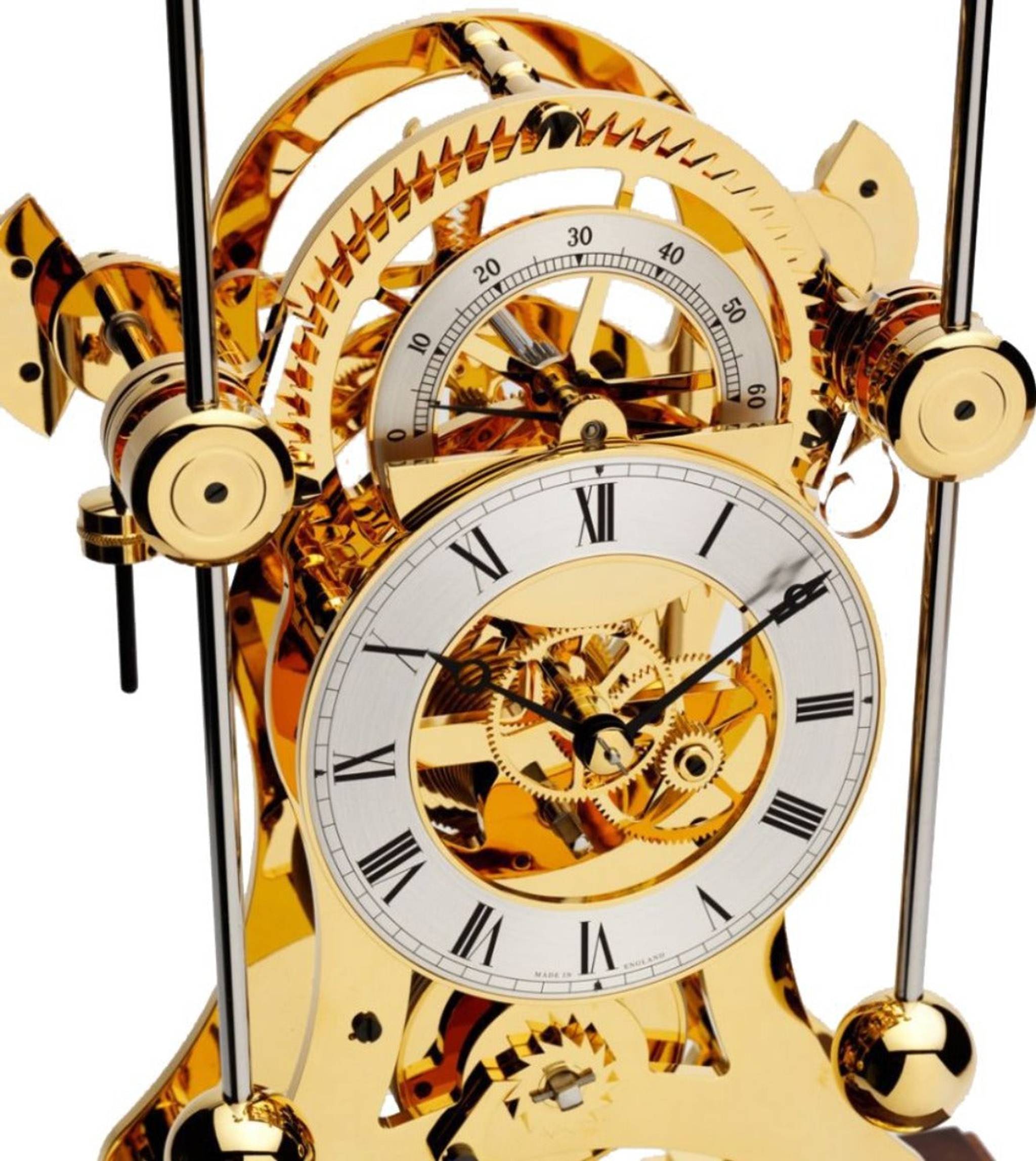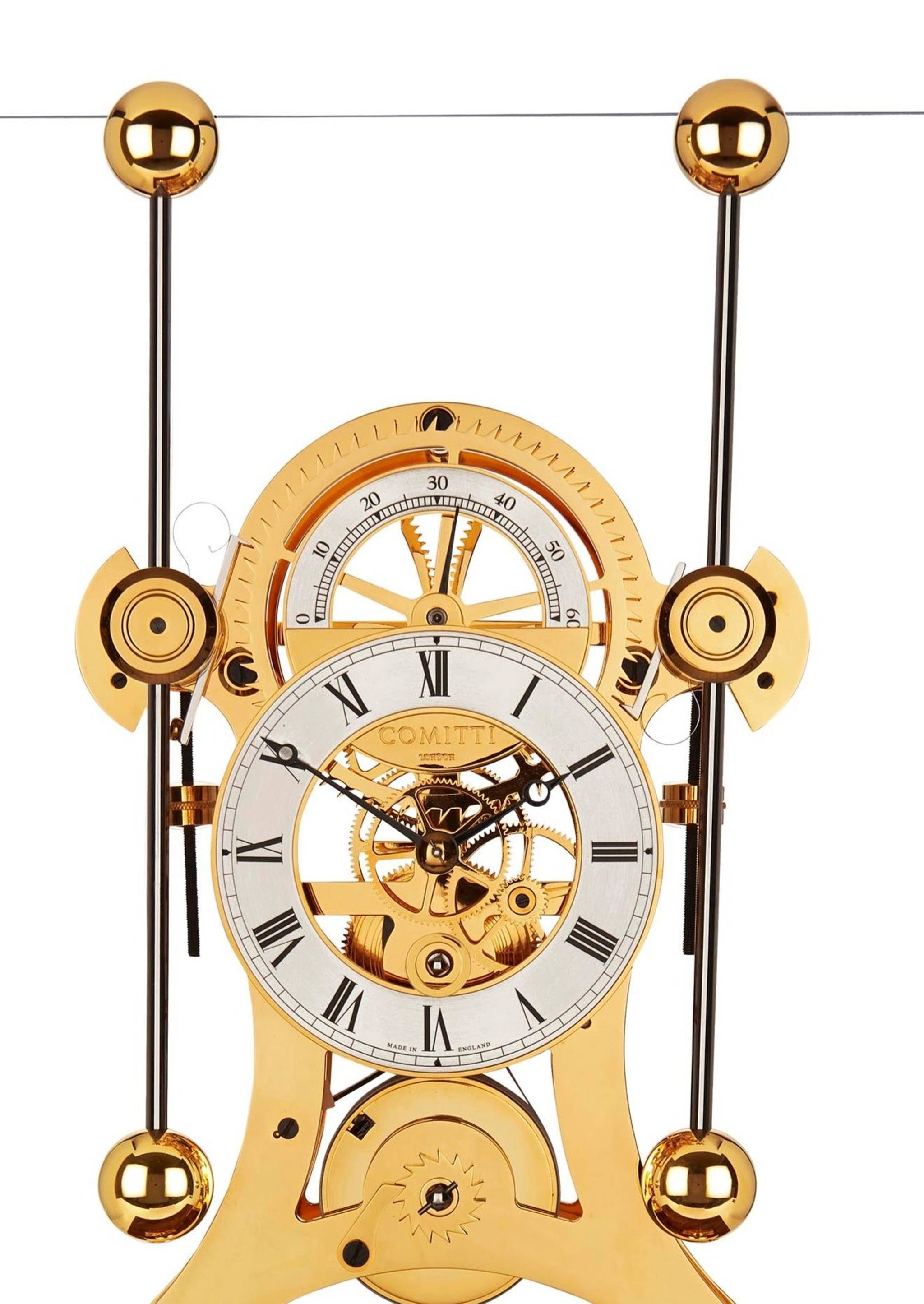A classic presentation of The Navigator grasshopper timepiece combining the gold plated movement and mahogany base.