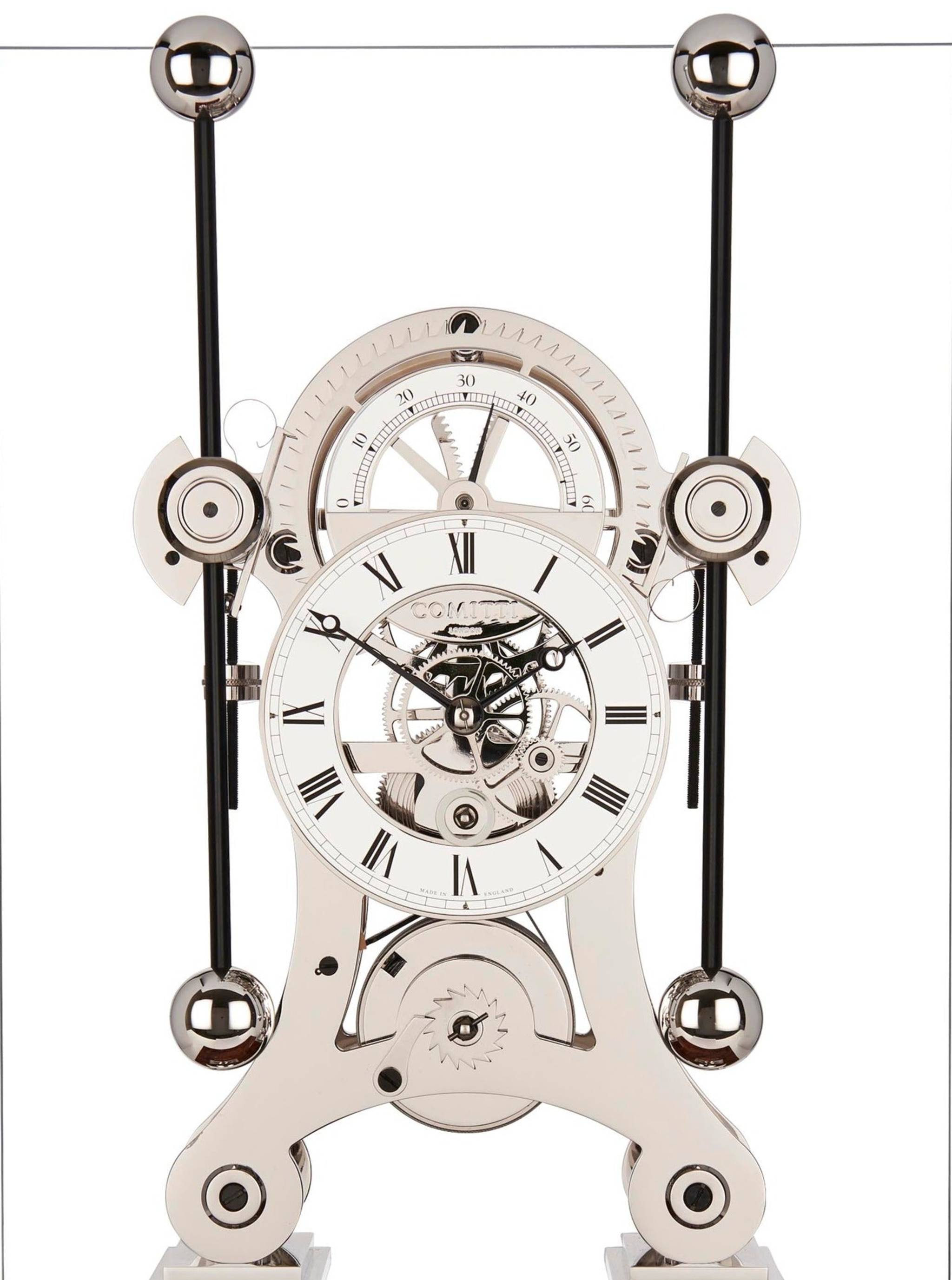 A contemporary take on a classic, presenting the The Navigator grasshopper timepiece combining the rhodium plated movement and Blue maple base.